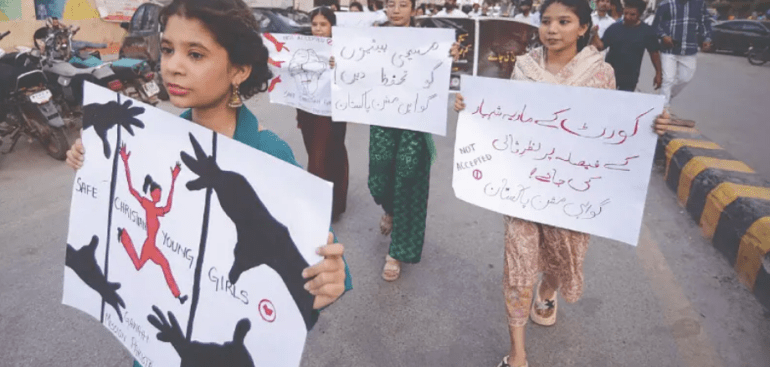 Outside the Karachi Press Club on a warm Sunday afternoon, the chorus of voices grew louder — women clutching hand-painted placards, young girls standing shoulder to shoulder with elders, all united by a single plea: “Protect our daughters.”